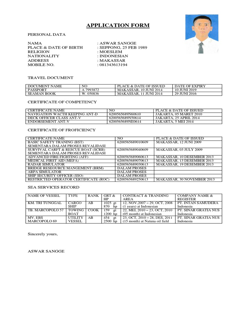 96 curriculum vitae bahasa inggris pelaut. Ya itulah tips contoh cv pelaut yang baik dan benar. Karena itu jika anda membutuhkan contoh cv pelaut silahkan download contoh cv pelaut yang telah kami sediakan file nya. Cv atau nama lainnya daftar riwayat hidup dalam bahasa inggris kadang sangat dibutuhkan walaupun bekerja di perusahaan instansi dalam negeri. Cv lamaran kerja bahasa inggris yang menarik bukan hanya dilihat dari cover atau desain tetapi juga gaya penulisan dan kerapihan dad berbagai sisi.
